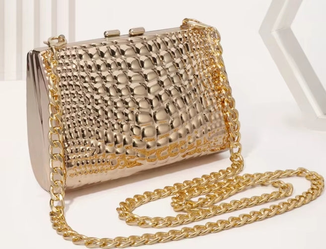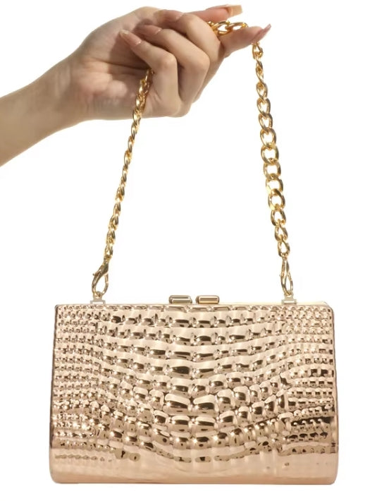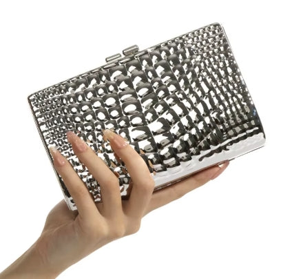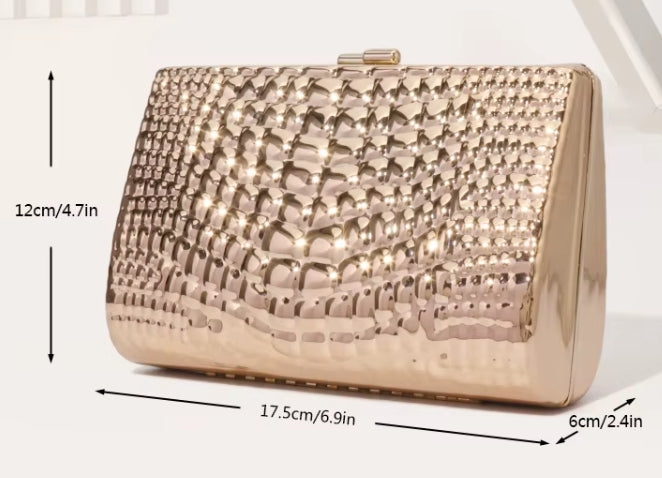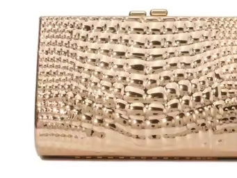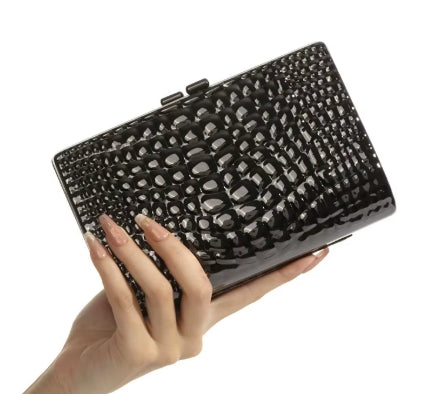 Indulge in luxury with our snake-patterned evening bag. Enhanced with shiny finish for an extra shot of glam, top snap closure and removable metal chain included.